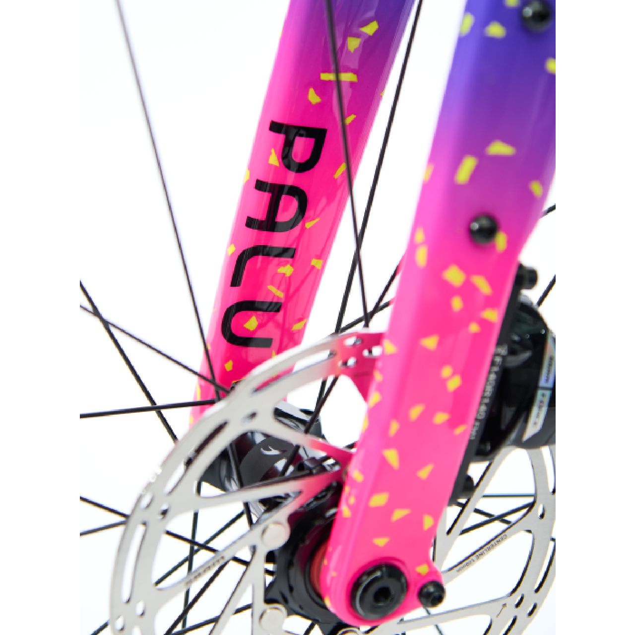 Il design è caratterizzato da uno stile popping e da un esclusivo effetto che richiama le sfumature dinamiche della sua divisa da gara. Il tocco distintivo è rappresentato dalle “briciole” in vernice giallo fluo, inglobate nella verniciatura della forcella e applicate rigorosamente a mano da Alberto: una firma artigianale unica che rende il telaio irripetibile e ancora più autentico, creando un legame visivo potente tra la bici e l’energia esplosiva di Nicolò. Il tutto viene infine rifinito con un finish lucido, rendendo ogni dettaglio autenticamente unico.